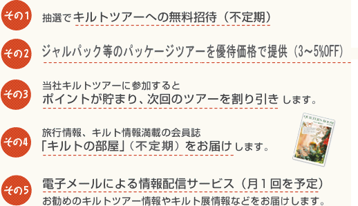 - キルトの部屋メンバーズクラブには入会の条件はありません。どなたでも入会できます。また、退会も 自由です。ただし、クラブの運営に支障をきたすおそれのある行為や、第三者に対して迷惑を与える行 為、また基本的なマナー等守れない方は入会をお断りすることがあります。